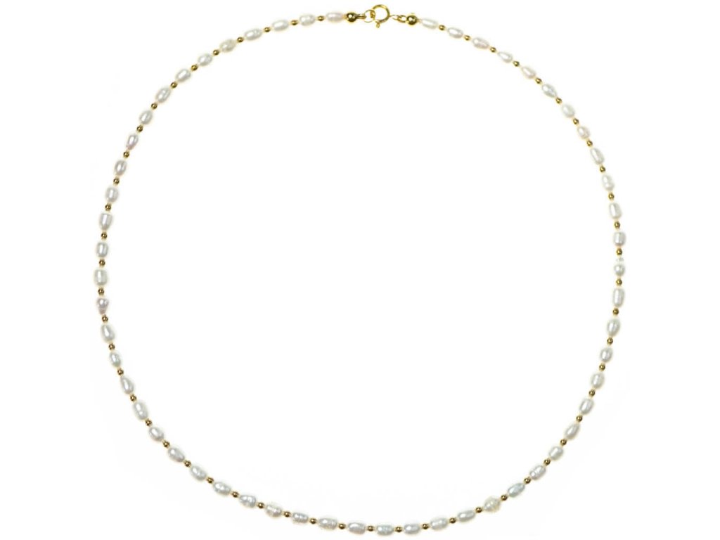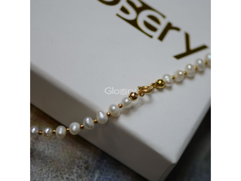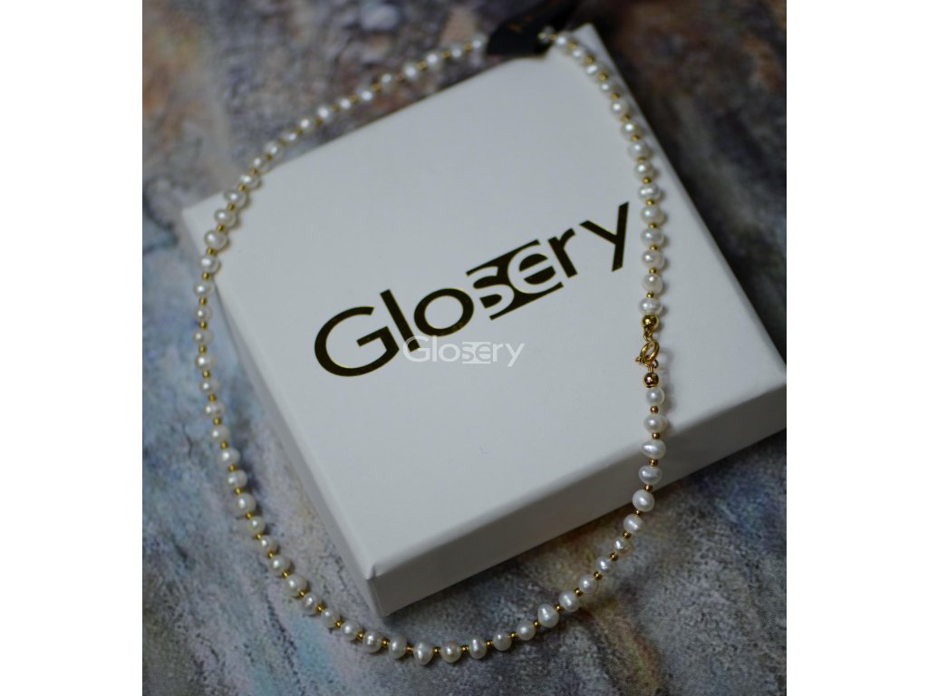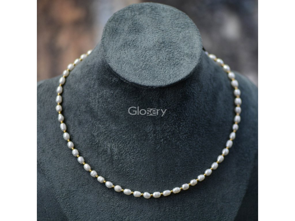 Elegantný dámsky perlový náhrdelník Glosery, vyskladaný z pravých riečnych perál v okrúhlom / podlhovastom (ryžovom) tvare, veľkosti 4–5 mm, v jemnej bielo-smotanovej farbe. Náhrdelník zdobia stopery, ktoré sú dostupné v štyroch farebných prevedeniach.