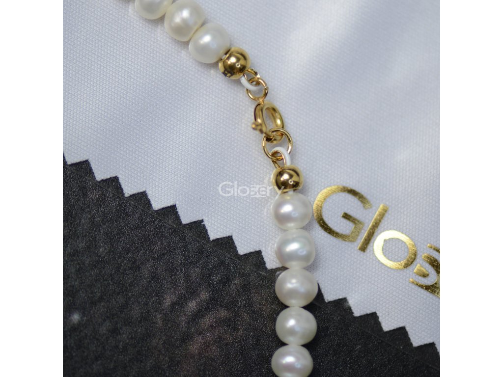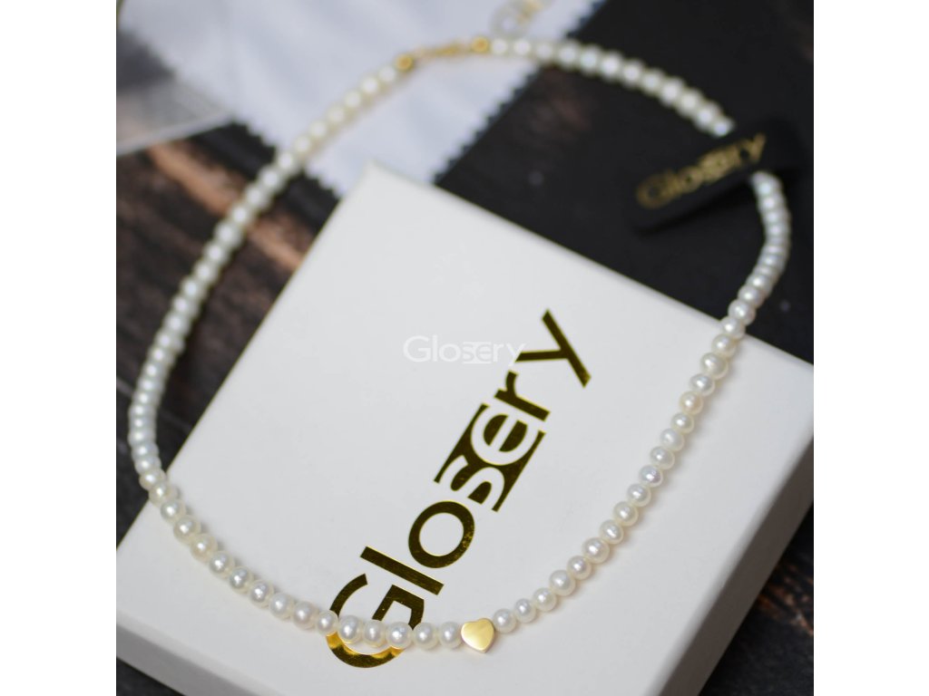 Elegantný dámsky náhrdelník Glosery, vyskladaný z pravých riečnych perál v okrúhlom / podlhovastom (ryžovom) tvare, veľkosti 4–5 mm, v jemnej bielo-smotanovej farbe. Náhrdelník zdobí malé srdiečko.