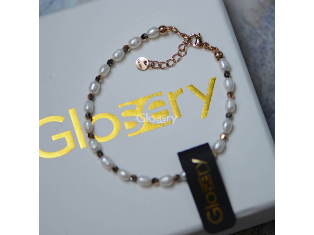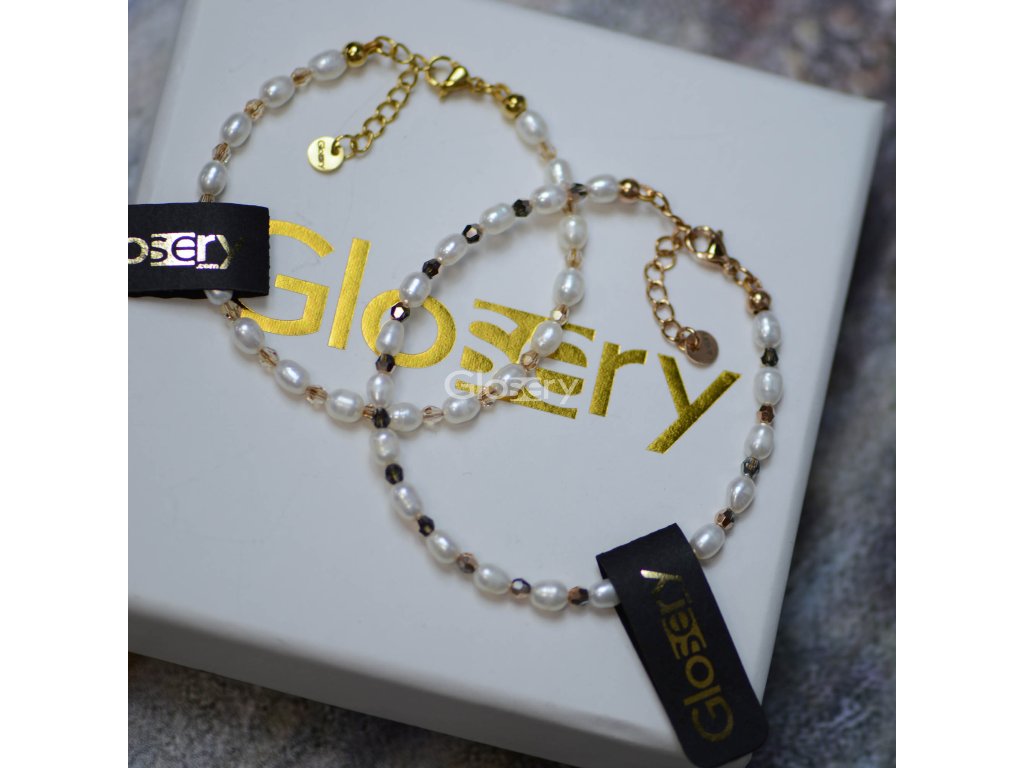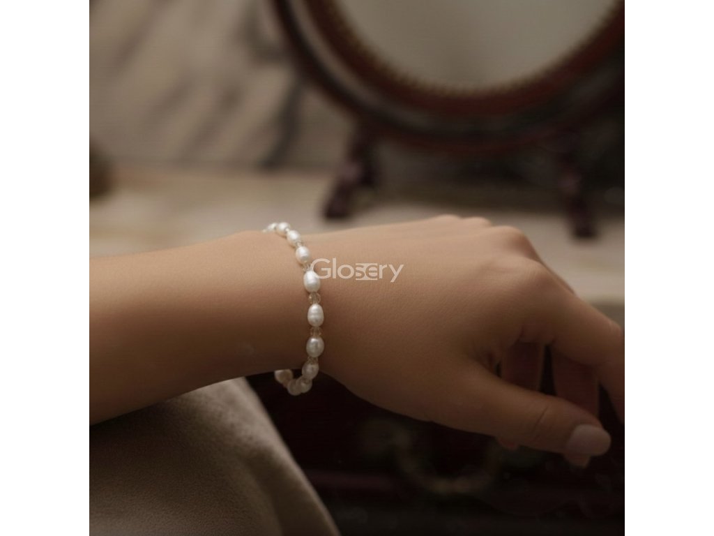 Elegantný dámsky náramok Glosery, vyskladaný z pravých riečnych perál v okrúhlom / podlhovastom (ryžovom) tvare, veľkosti 4–5 mm, v jemnej bielo-smotanovej farbe. Náramok zdobia krištále, ktoré mu dodávajú žiarivý lesk a noblesu.