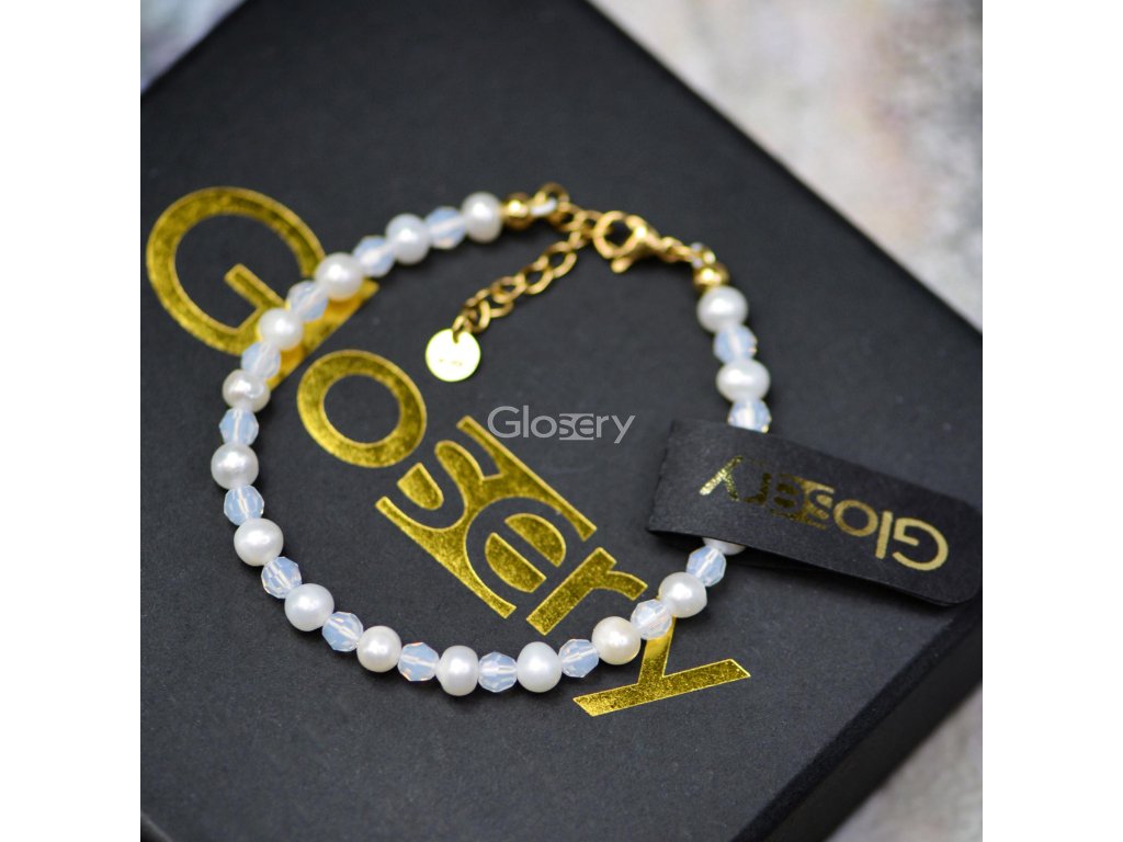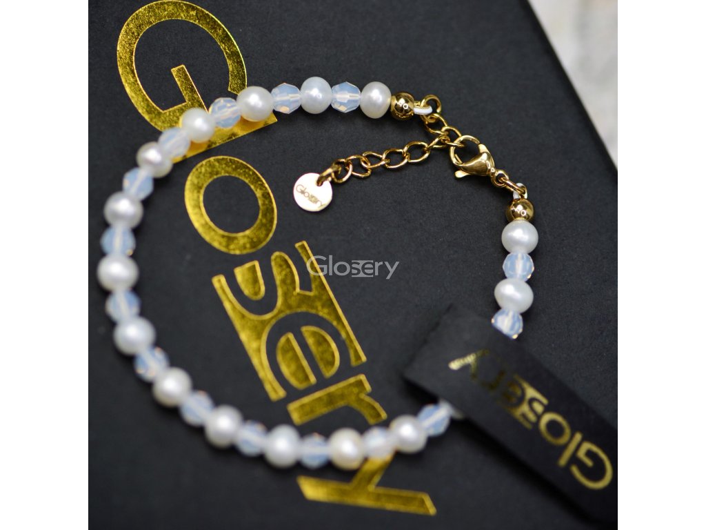 Luxusný dámsky náramok Glosery, vyskladaný zo sladkovodných perál v kombinácii s kríštáľmi od Swarovski, veľkosti 4–6 mm, v jemnej bielej farbe.