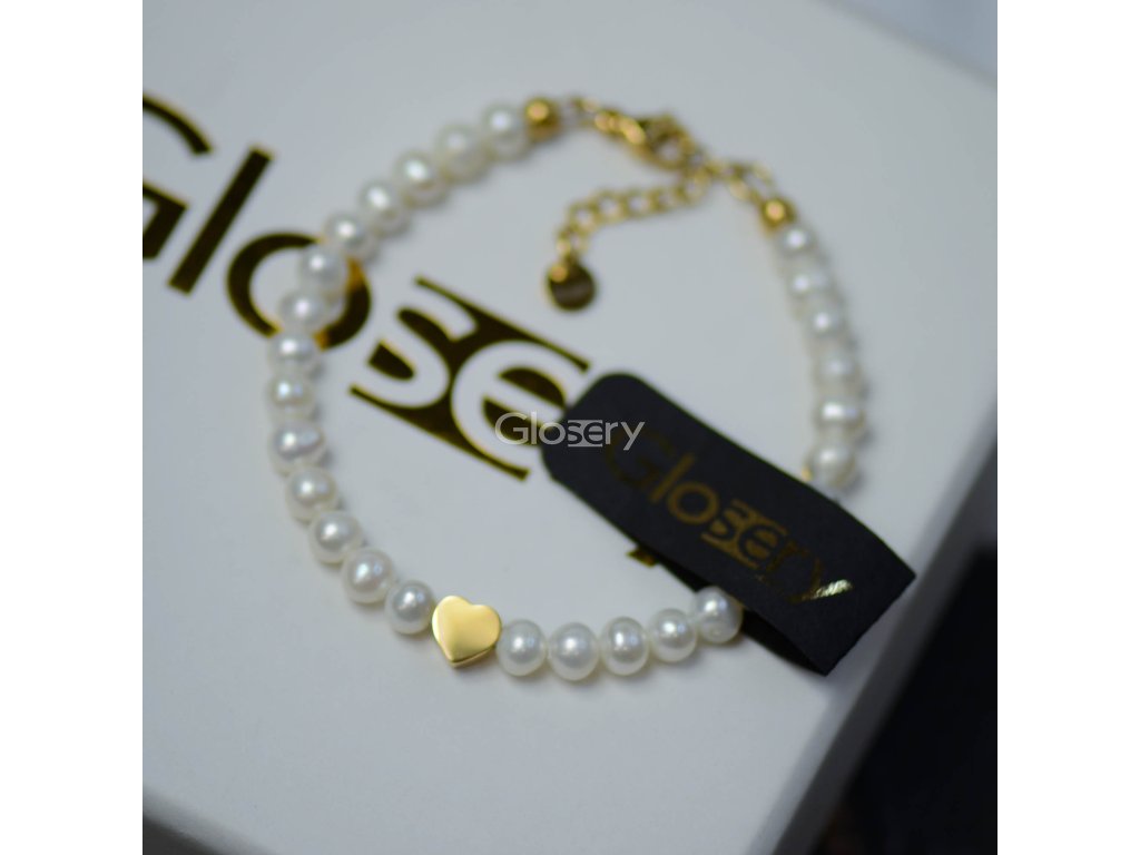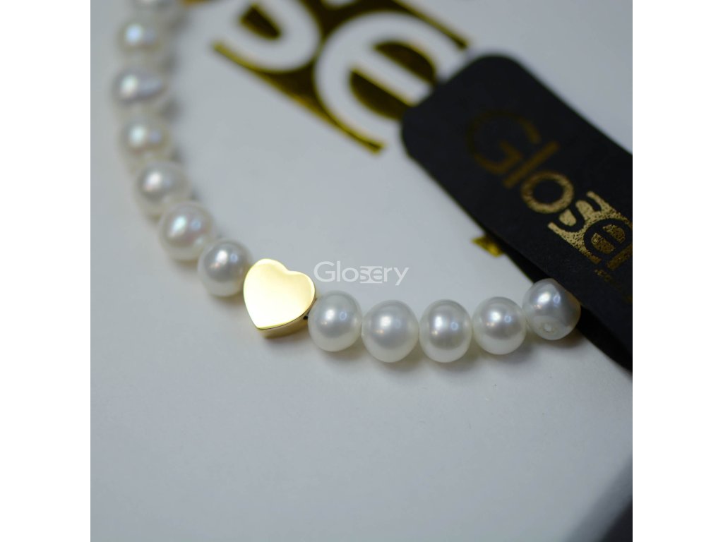 Elegantný dámsky náramok Glosery, vyskladaný z pravých riečnych perál v okrúhlom / podlhovastom (ryžovom) tvare, veľkosti 4–5 mm, v jemnej bielo-smotanovej farbe. Náramok zdobí srdce, ktoré je dostupné v 4 farebných prevedeniach.