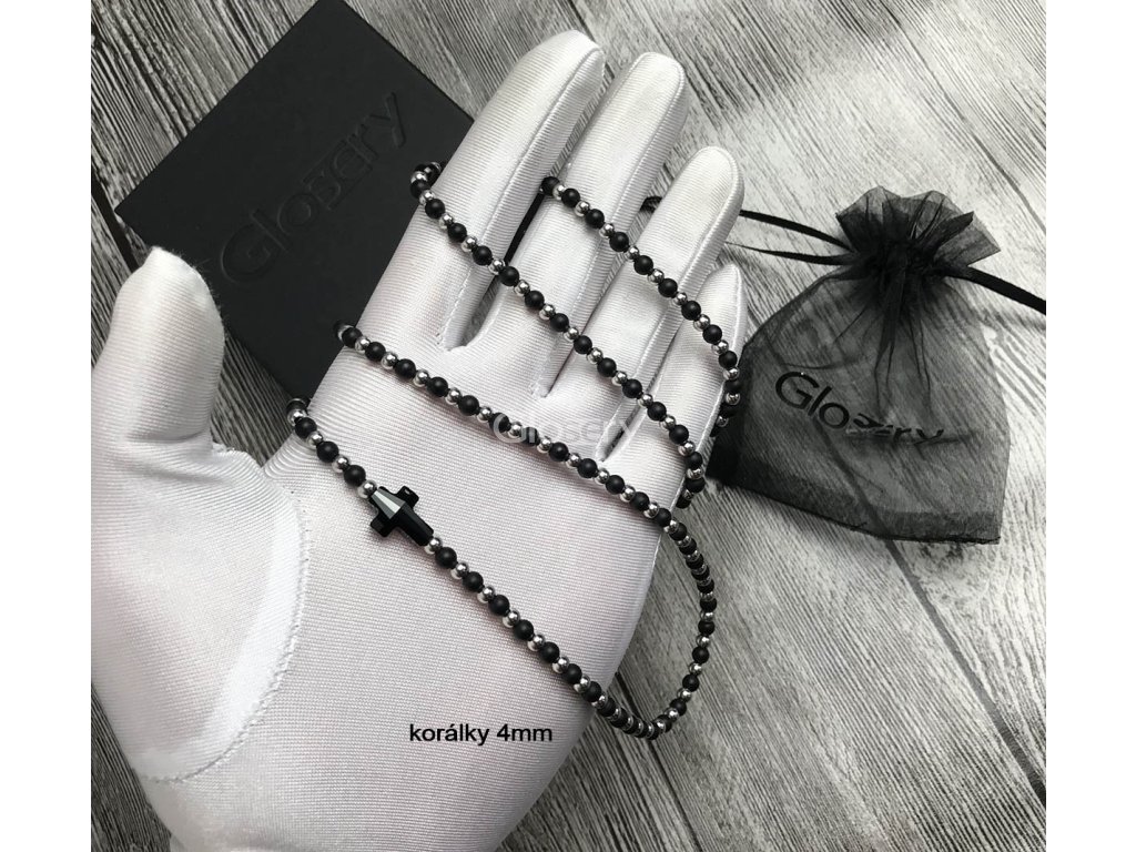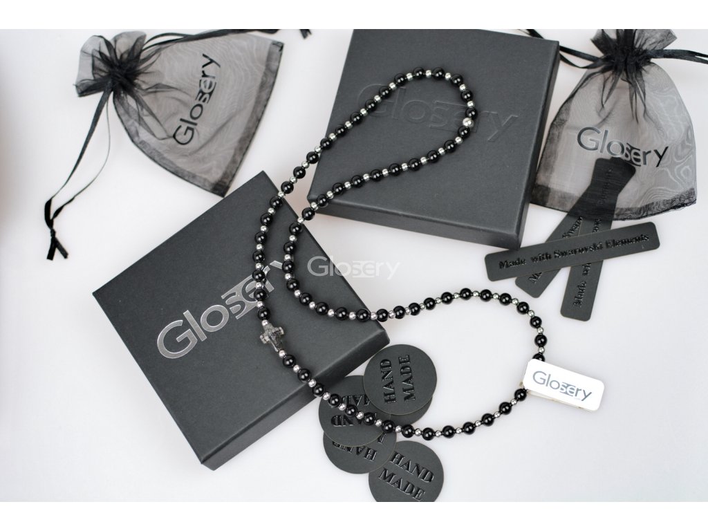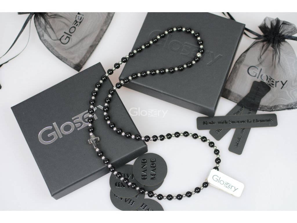 Jedinečný Glosery náhrdelník vyskladaný z leského / matného čierneho achátu 4-6mm v kombinácii s chirurgickou oceľou 4mm. Náhrdelník je zdobený lesknúcim krištáľom v tvare krížika od Swarovski® v rôznych farbách a je ukončený korálkou z chirurgickej ocele s logom Glosery. Na výber sú rôzne farebné kombinácie prvkov (Swarovski® krištáľ - krížik, korálka s logom).