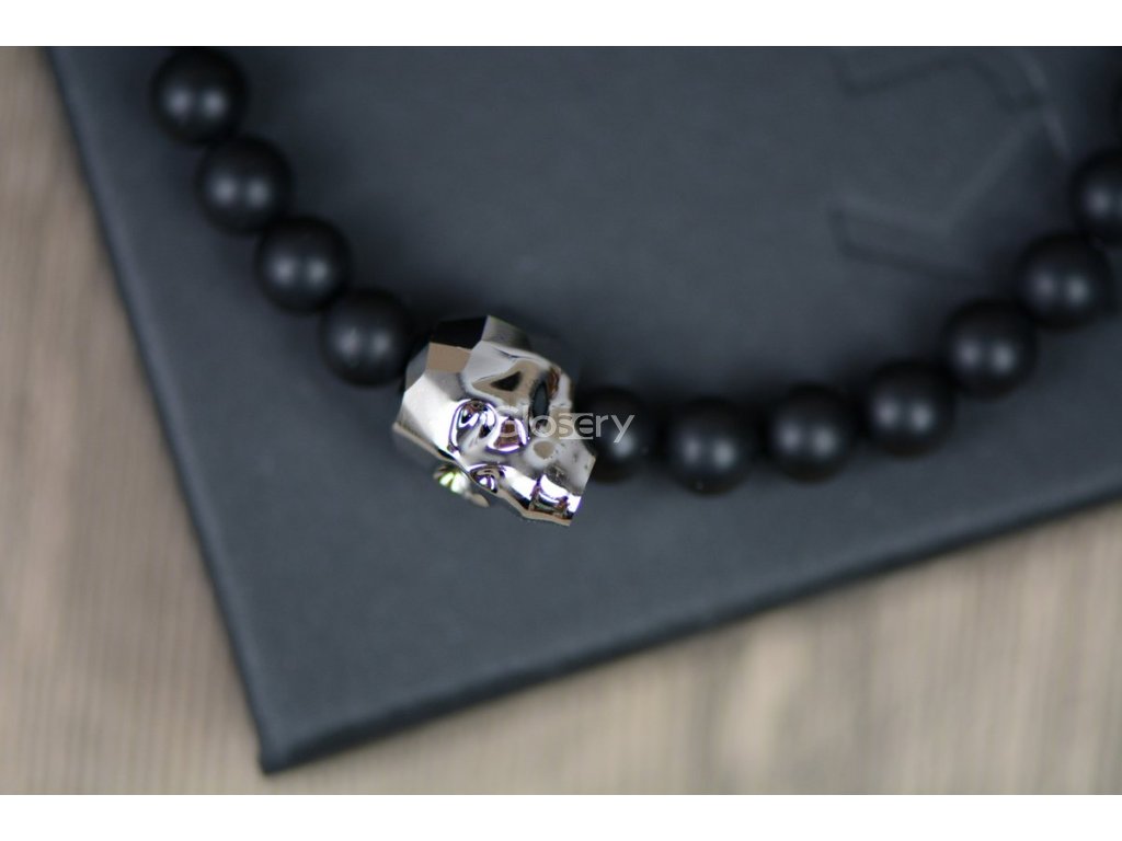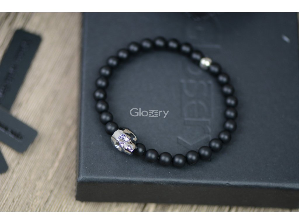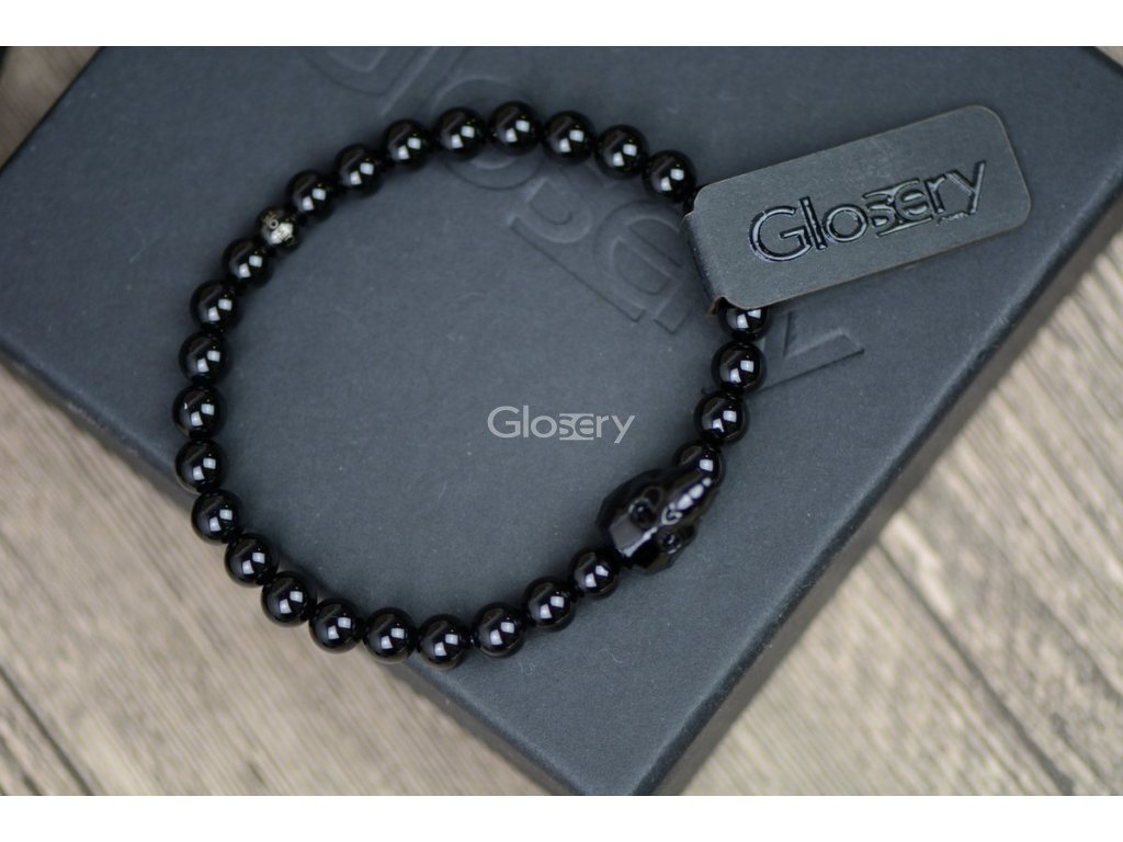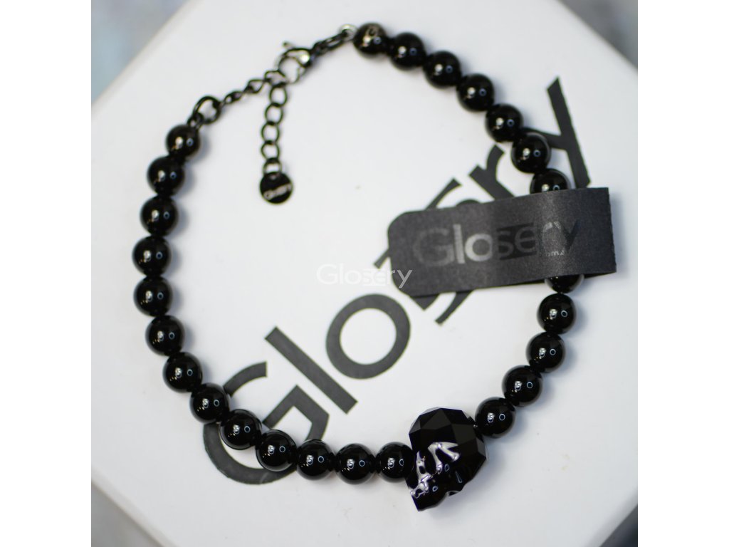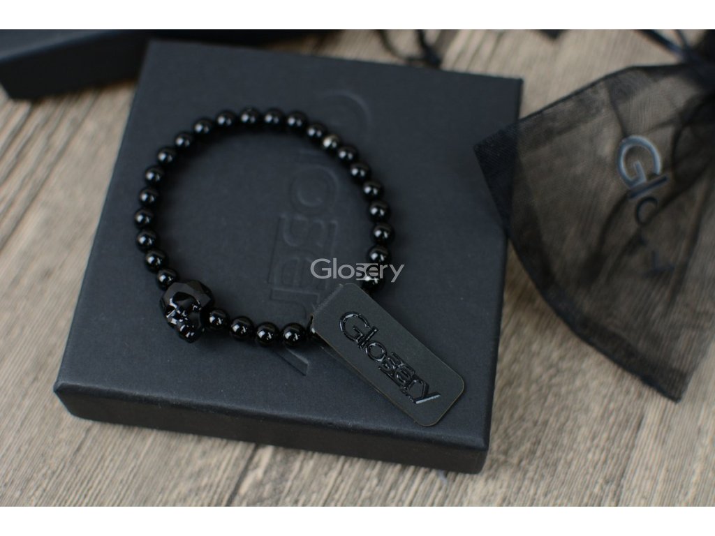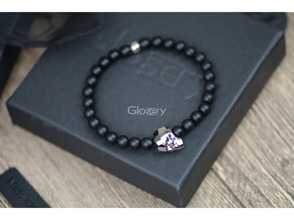 Pánsky Glosery náramok s výrazným Swarovski® krištáľom v tvare lebky, dostupným v čiernom alebo striebornom prevedení. Kombinácia lesklého alebo matného čierneho achátu dodáva náramku elegantný, no zároveň drsný charakter. Dizajn dopĺňa korálka z chirurgickej ocele s logom Glosery.