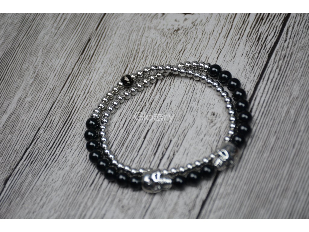 Wrap náramok, lebky, stopery a korálky z chirurgickej ocele, lesklý / matný čierny achát 6mm