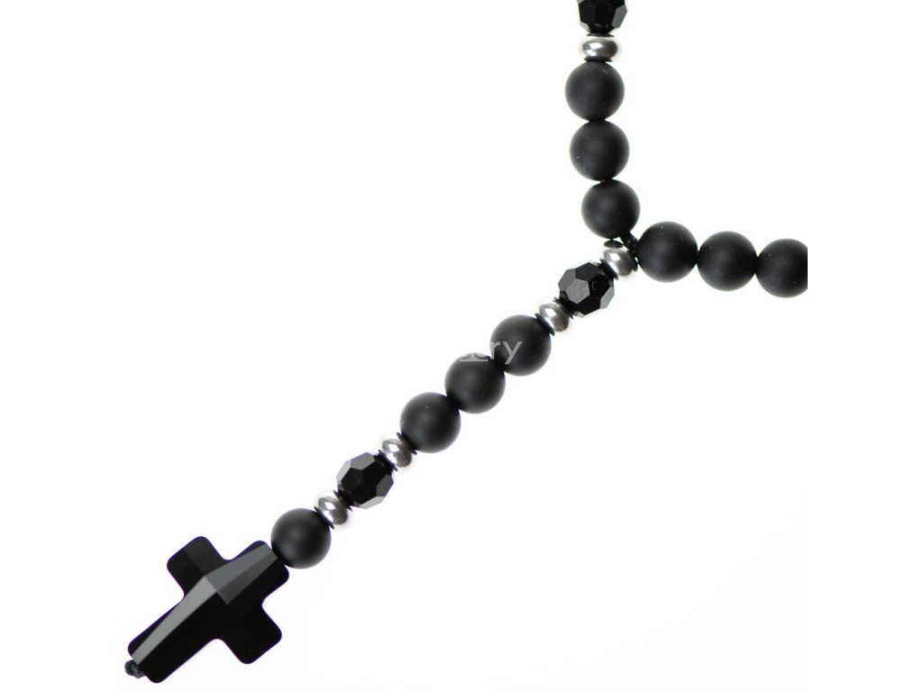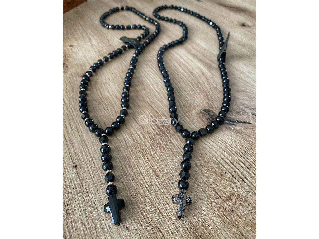 Luxusný Glosery náhrdelník s lesknúcími krištáľmi v tvare disko gúľ od Swarovski® v kombinácii so stopermi - zlaté, strieborné. Náhrdelník svojim designom pripomína ruženec. Vyskladaný je z kameňa lesklý / matný čierný achát v priemere 6-8mm. Náhrdelník je ukončený korálkou s logom Glosery.