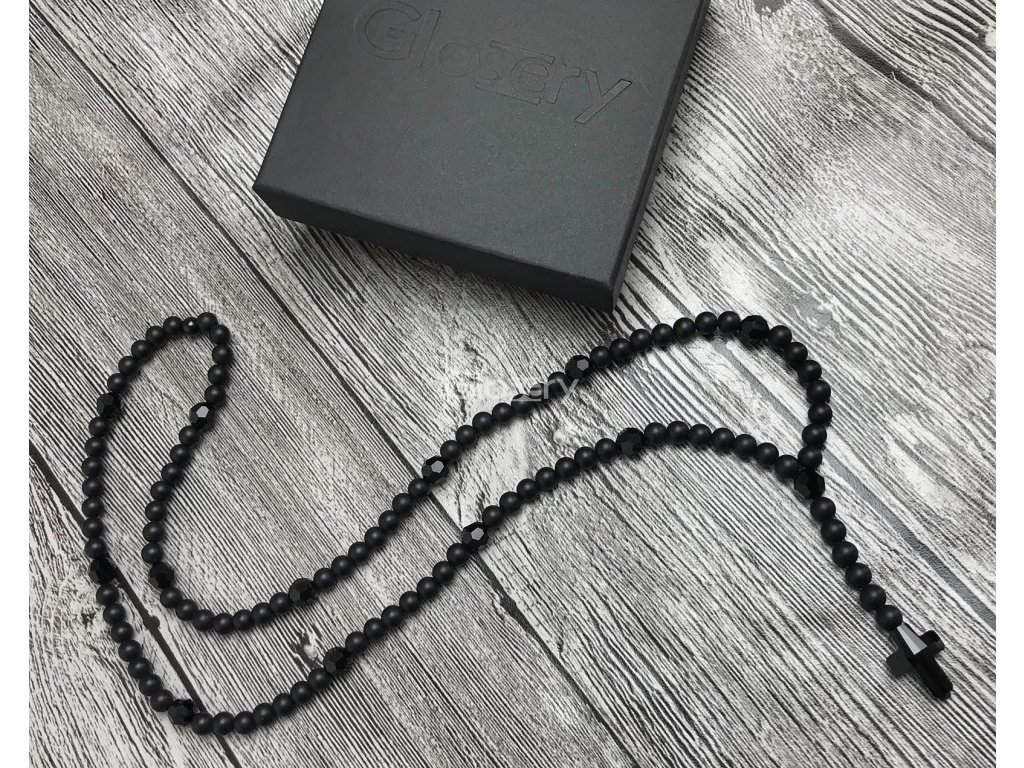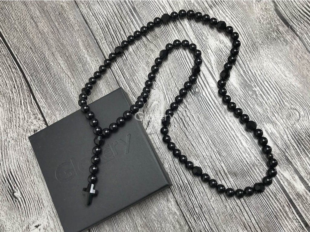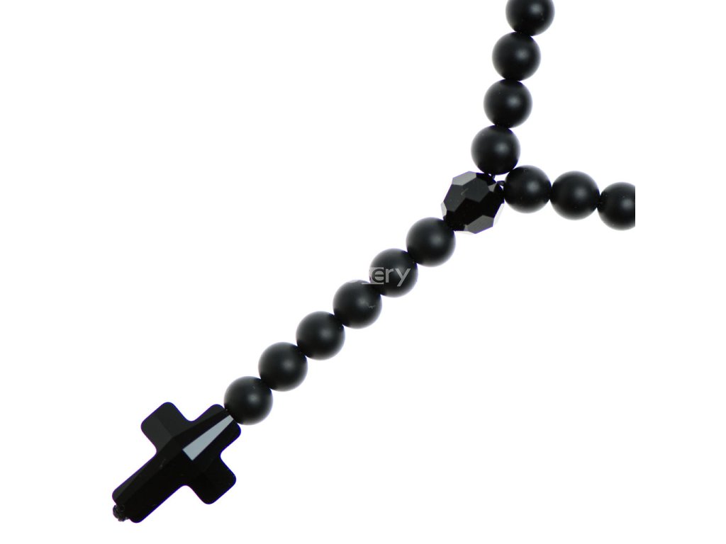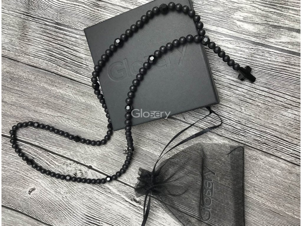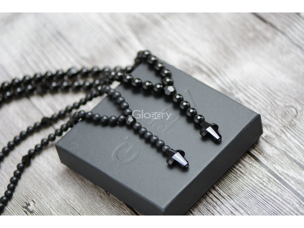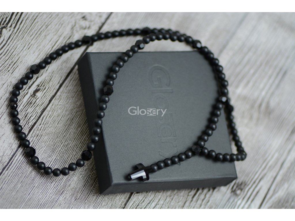 Glosery náhrdelník s lesknúcim krištáľom v tvare krížika a disko guľami od Swarovski®. Náhrdelník svojim designom pripomína ruženec. Vyskladaný je z kameňa leský / matný čierný achát v priemere 6-8mm v kombinácii s disko guľami od Swarovski® a je ukončený korálkou s logom Glosery.