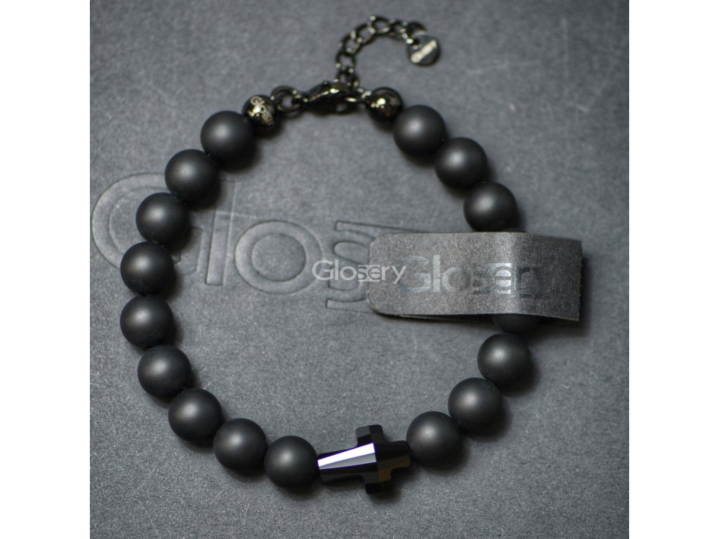 Unisex Glosery náramok zdobený lesknúcim krištáľom od spoločnosti Swarovski®. Krištáľ je v tvare krížika. Náramok je vyskladaný z lesklého / matného čierneho achátu, labradoritu, lávového kameňa, tigrieho oka, howlite bieleho a zakončený čiernou korálkou z chirurgickej ocele s logom Glosery.