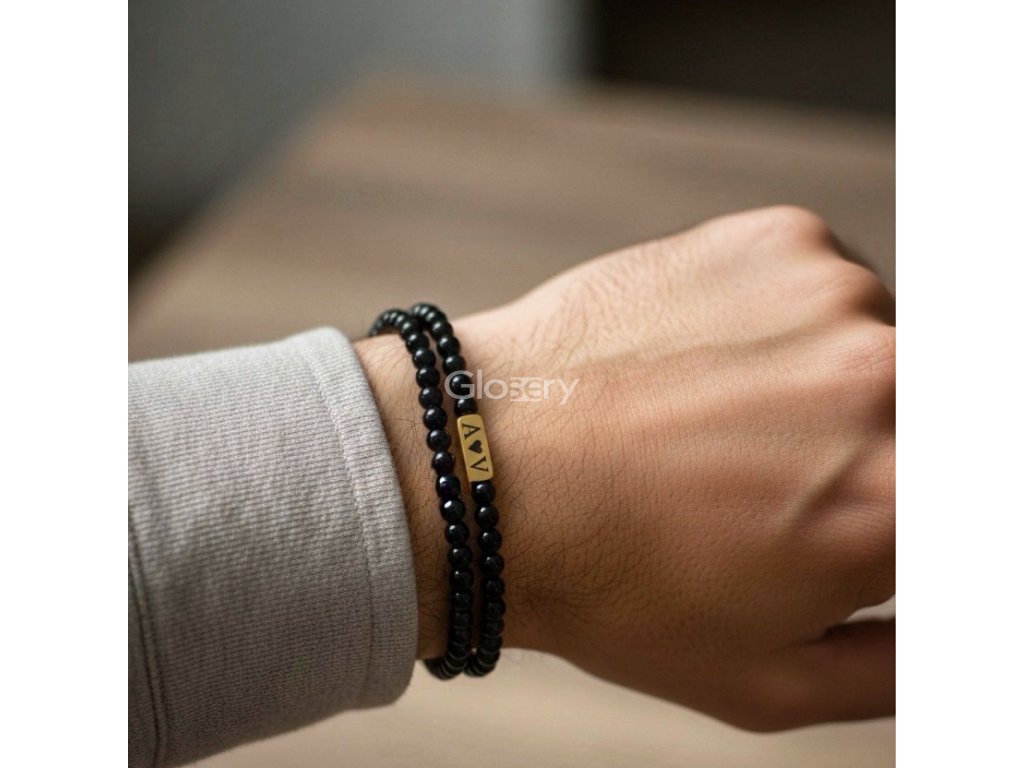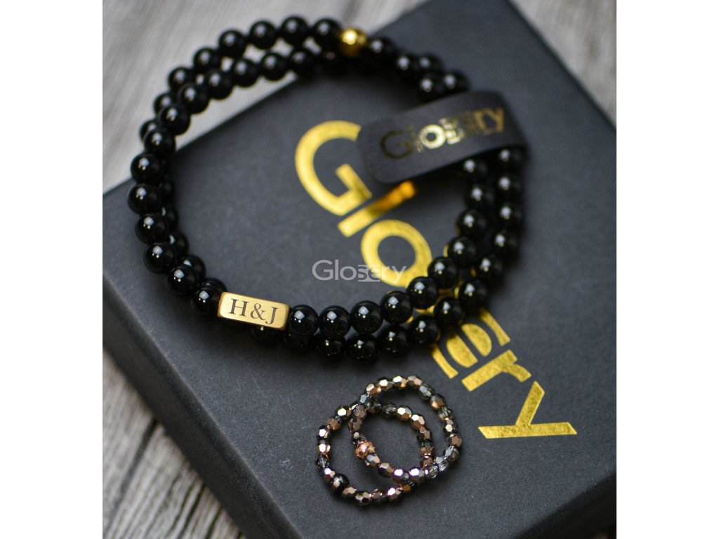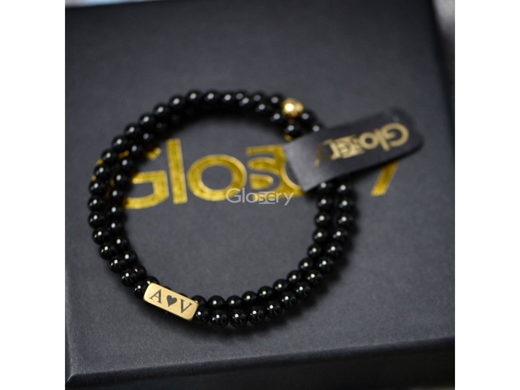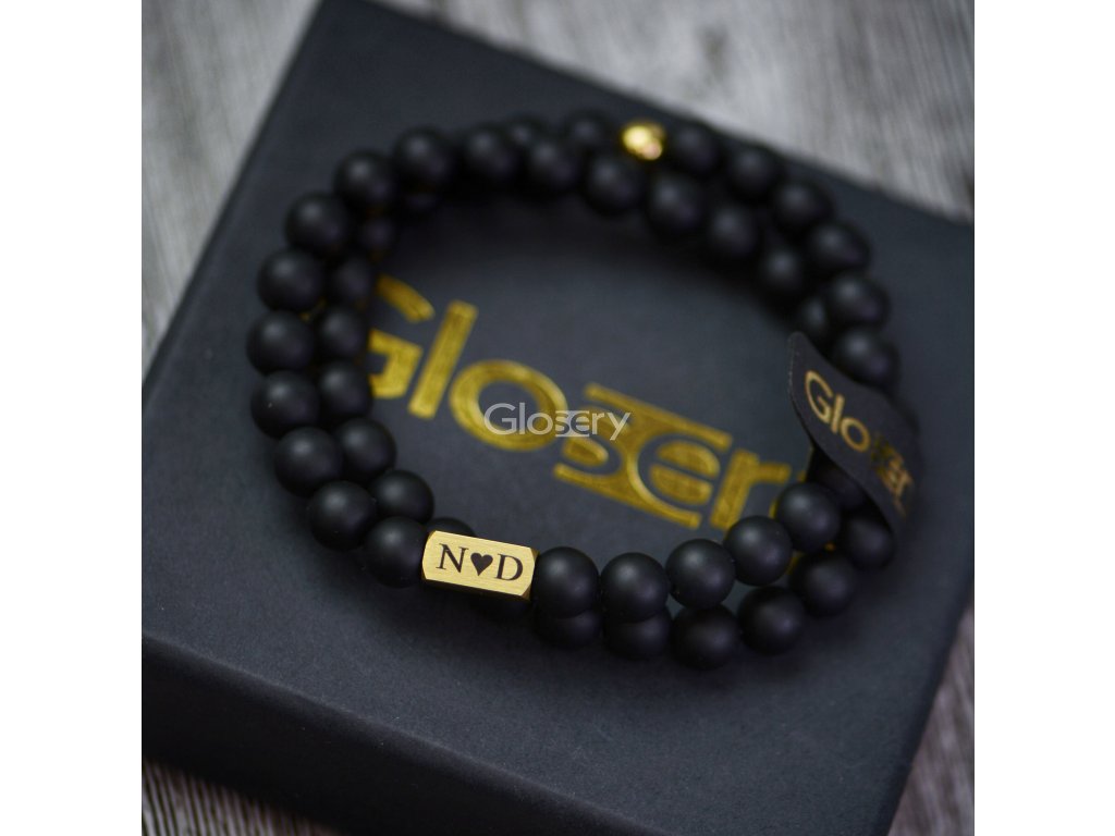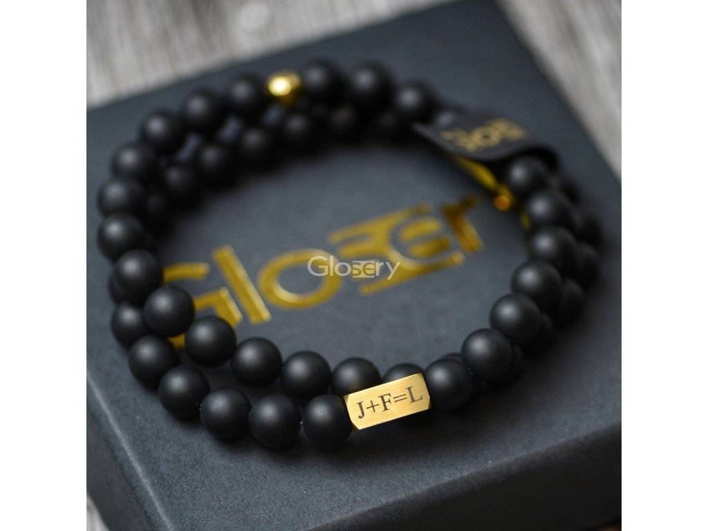 Glosery náramok s kvádrom, na ktorý je možné gravírovať na mieru. Náramok je vyskladaný z kameňa podľa výberu - lesklý / matný čierny achát, lavový kameň a labradorit. Kváder je z chir. ocele v 4 farebných prevedeniach. Náramok je zakončený korálkou z chirurgickej ocele s logom Glosery prispôsobenej k farbe prívesku.