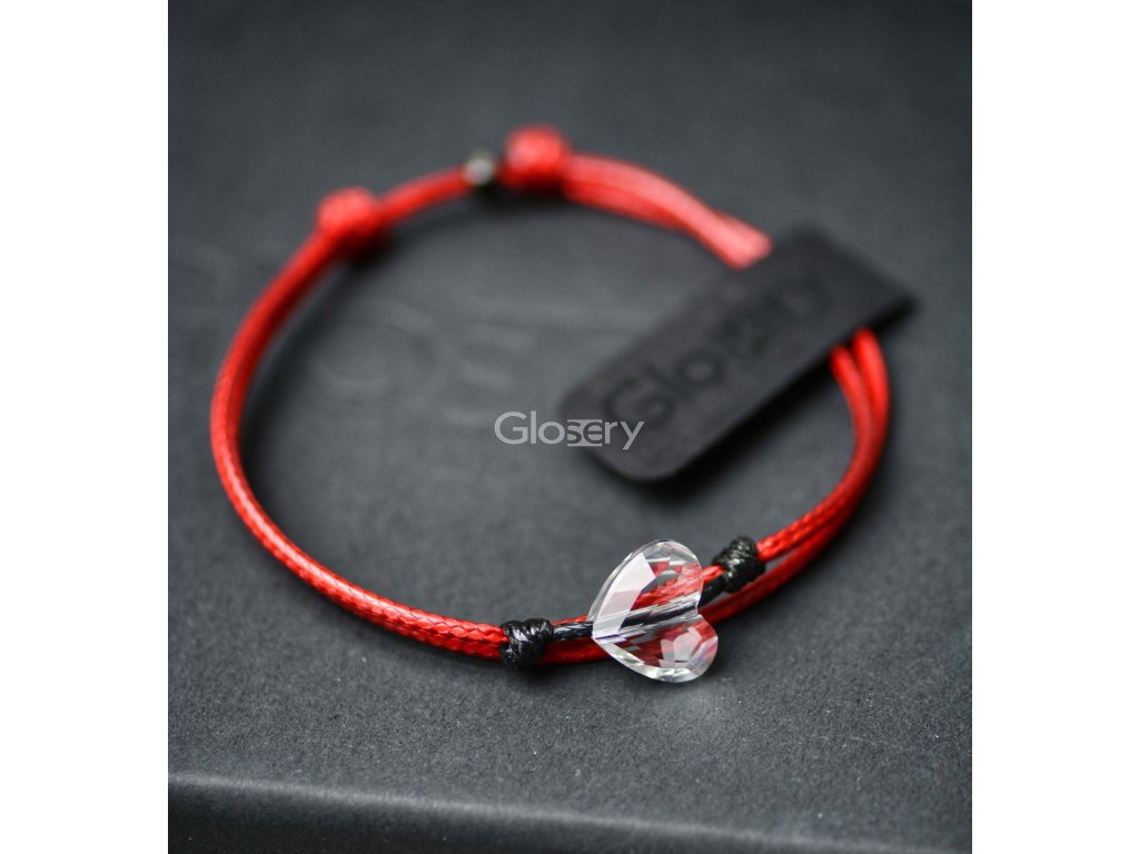 Jedinečný unisex šnúrkový Glosery náramok zdobený lesknúcim krištáľom - srdcom od spoločnosti Swarovski®. Srdce je umiestnené v strede na mini šnúrke. Červený náramok je dostupný v kombinácii s mini šnúrkou a srdcom v rôznych farebných kombináciach. Červená šnúrka je povoskovaná v priemere 1,5mm a je vodeodolná. Výhodou Glosery šnúrkového náramku je to, že sa nosí "nonstop". Veľkosť náramku je prispôsobená na mieru podľa veľkosti zápästia.