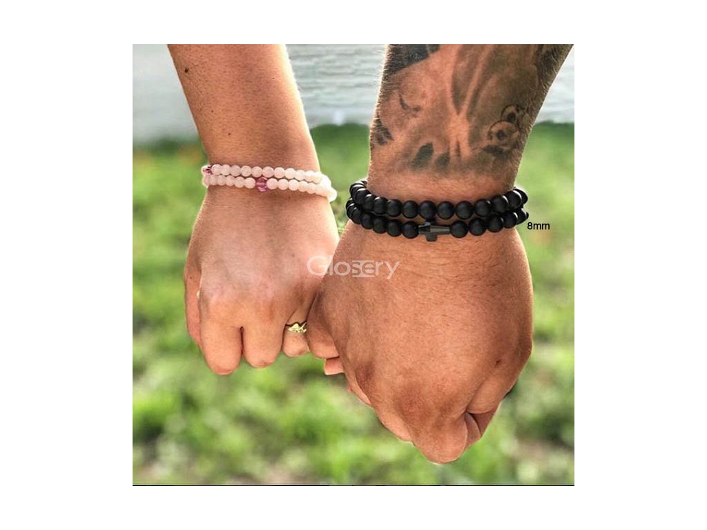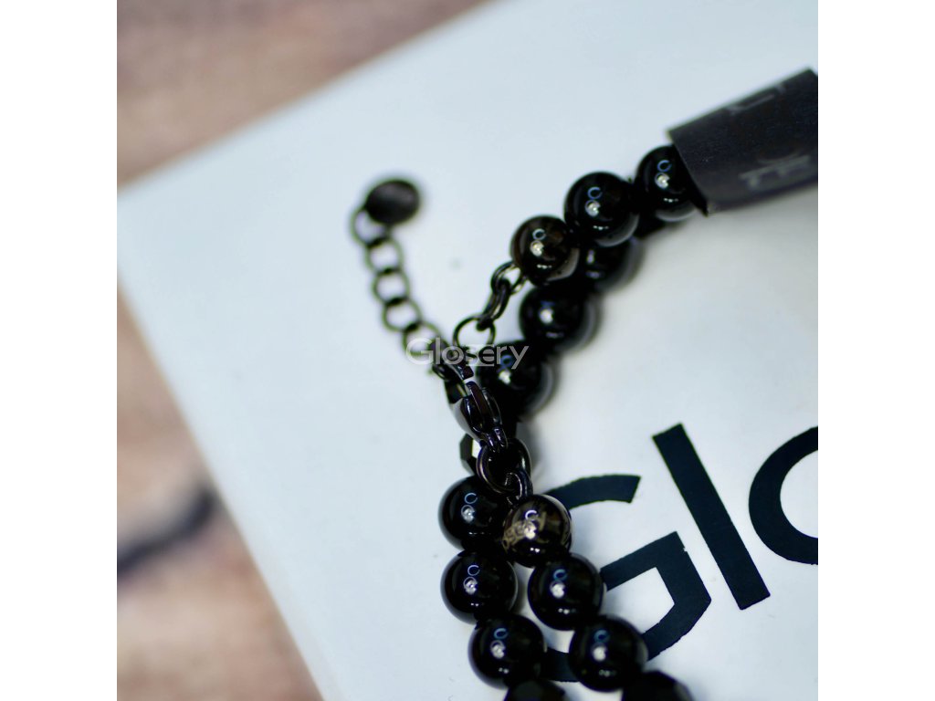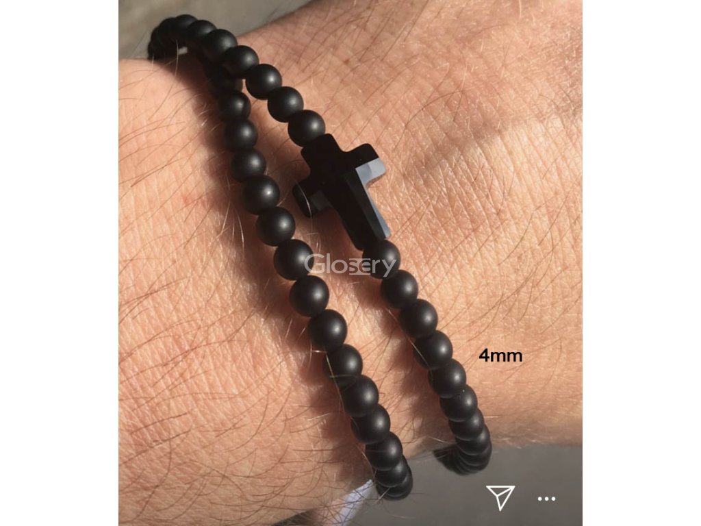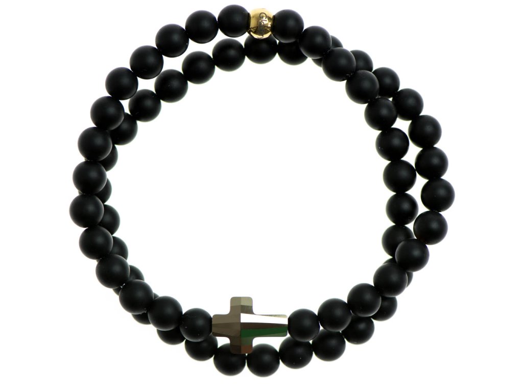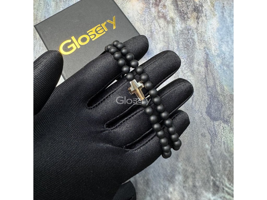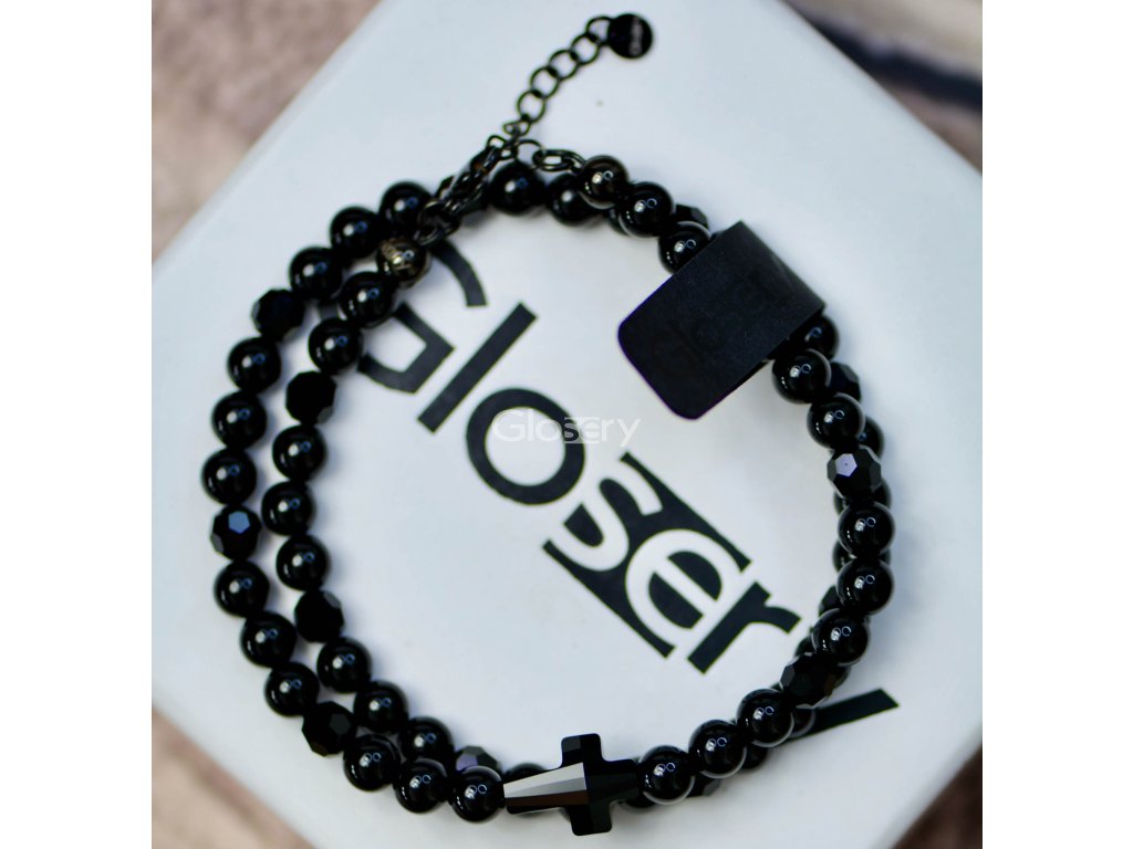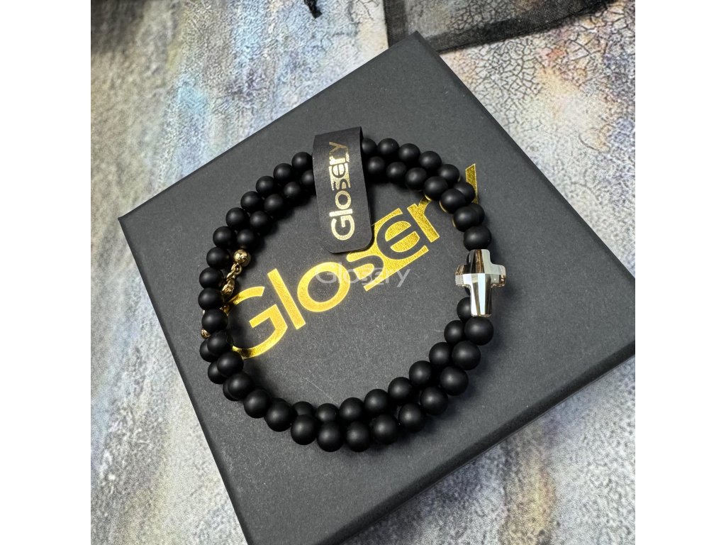 Unisex wrap náramok Glosery s jemným leskom a krištáľovým krížikom Swarovski®. Ručne vyrobený z kombinácie lesklého a matného čierneho achátu - ónyx, howlitu, labradoritu a lávového kameňa (4–8 mm), ktorý symbolizuje silu, rovnováhu a eleganciu. Náramok je zakončený korálkou s logom Glosery - detailom, ktorý dotvára jeho jedinečný charakter.