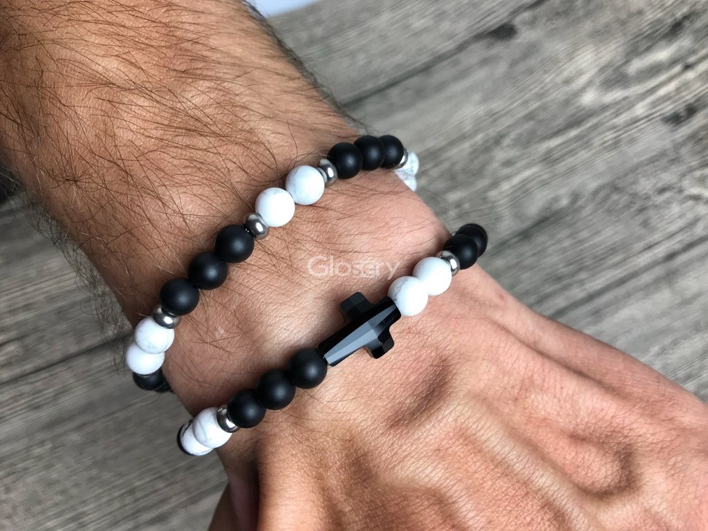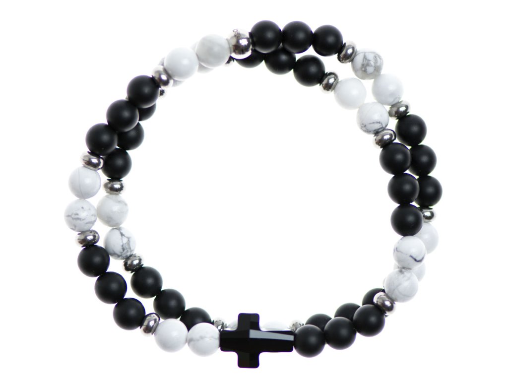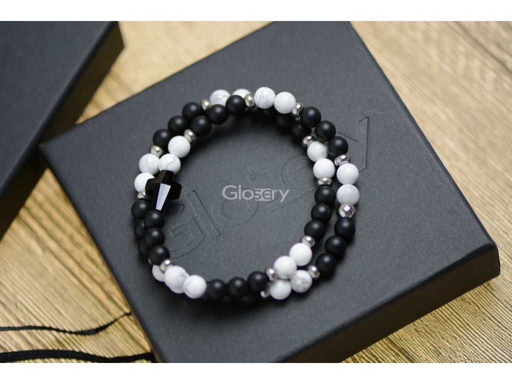 Náramok je vytvorený z bieleho howlitu v kombinácii s inými prírodnými kameňmi, napríklad lesklým alebo matným čiernym achátom, labradoritom, lávovým kameňom (4–6 mm). Jednotlivé kamene sú od seba oddelené stopermi z kvalitnej chirurgickej ocele, ktoré dodávajú náramku detail a trvácnosť.